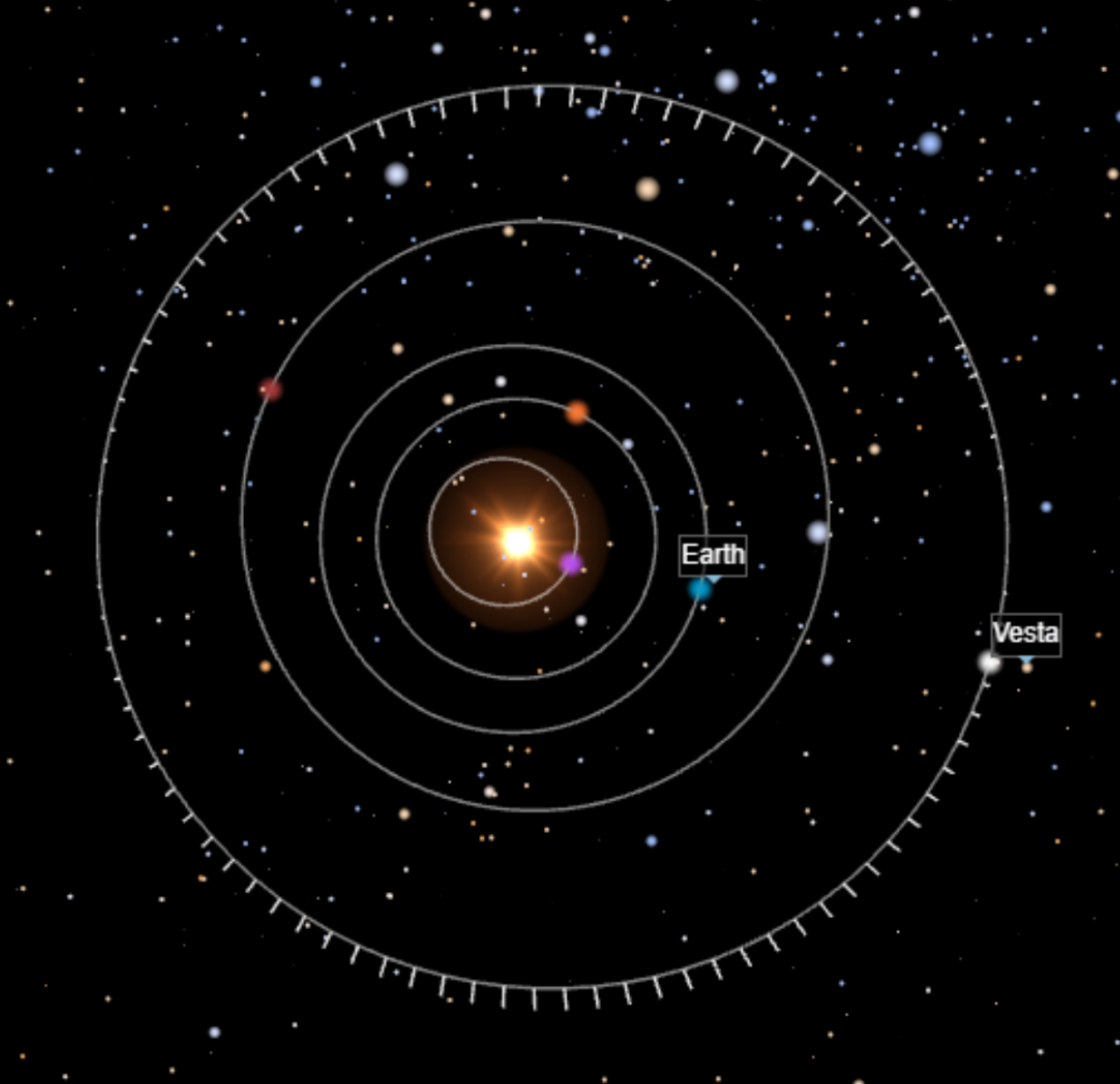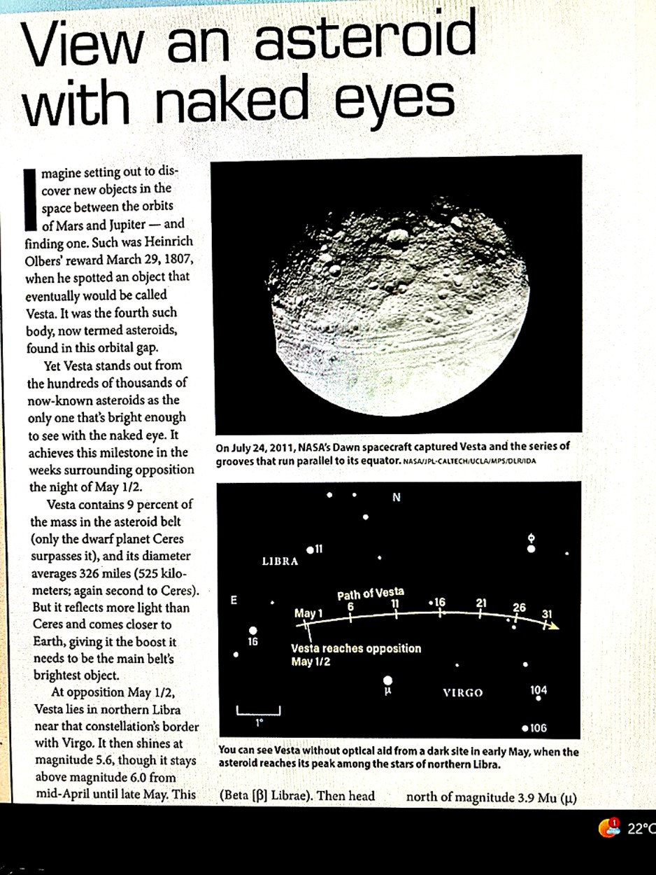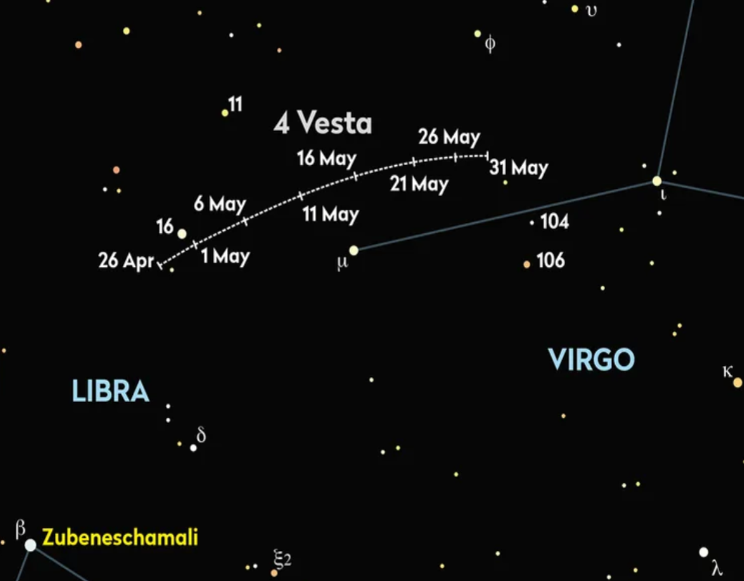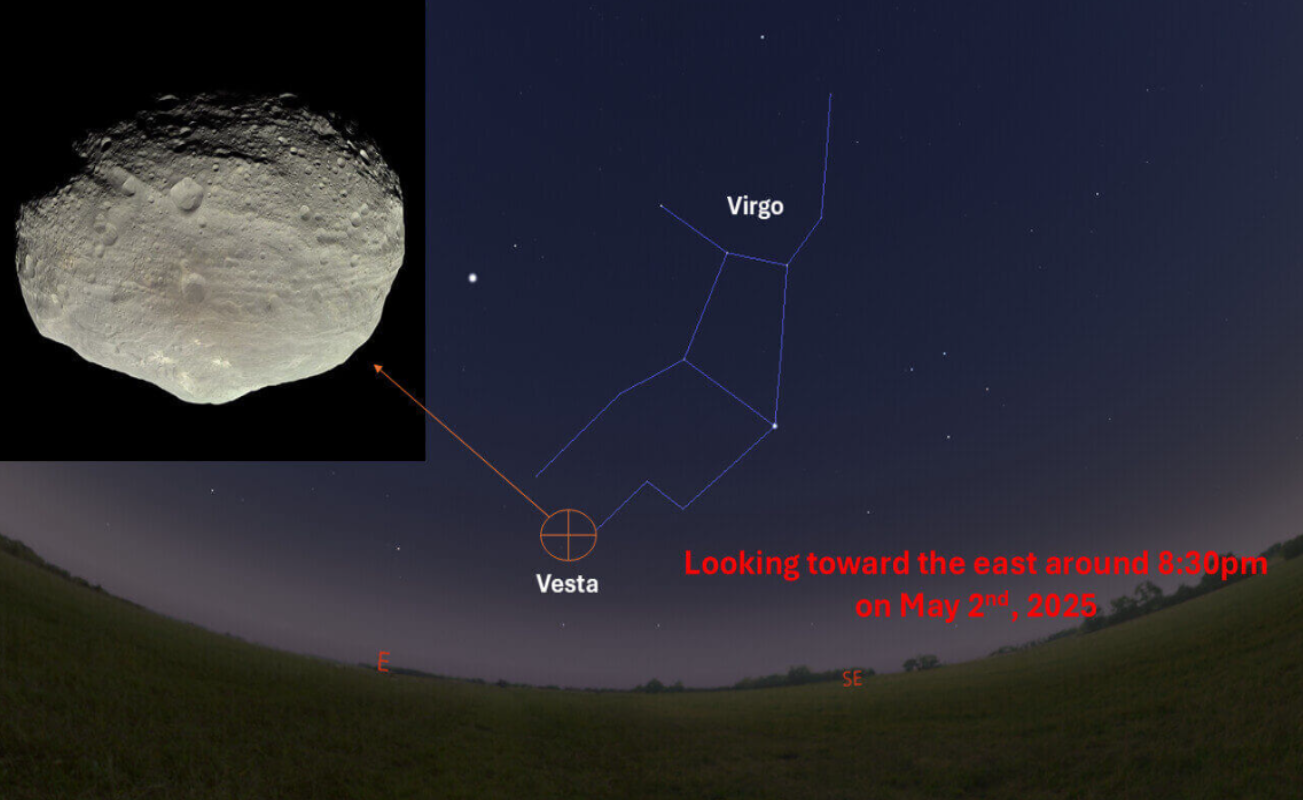 O asteroide 4 Vesta, classificado como Corpo Menor da Sistema Solar segundo Resolução B5 (3) da IAU em 2006, é um dos maiores objetos do cinturão de asteróides e o segundo mais massivo depois de Ceres. Foi o quarto planeta menor descoberto e é o mais brilhante, capaz de atingir um pico mag. de +5,1 durante um período extremamente favorável. Ele possui uma estrutura diferenciada, talvez sua verdadeira natureza seja a de um fragmento de um planeta em formação ou mesmo um protoplaneta. Um corpo do sistema solar é considerado em oposição quando está localizado no ponto oposto do céu em relação ao sol da perspectiva da Terra, permitindo que o sol o ilumine da nossa perspectiva. Este evento oferece uma grande oportunidade de ver uma rocha gigante do espaço, um objeto que orbita o Sol há bilhões de anos. Nesta oposição, ele está passando por seu ponto de perigeu, ou sua aproximação mais próxima da Terra. Esses dois fatores acontecendo ao mesmo tempo dão a Vesta sua magnitude extra brilhante. Em condições ideais, sua magnitude de +5,7 está na fronteira com o limite do que o olho nu pode ver (que é em torno de uma magnitude de 6,5). No dia 2 de maio, o asteroide Vesta alcançou sua a oposição, marcando o período ideal para avistar o segundo maior asteroide orbitando no cinturão rochoso de detritos localizado entre Marte e Júpiter.