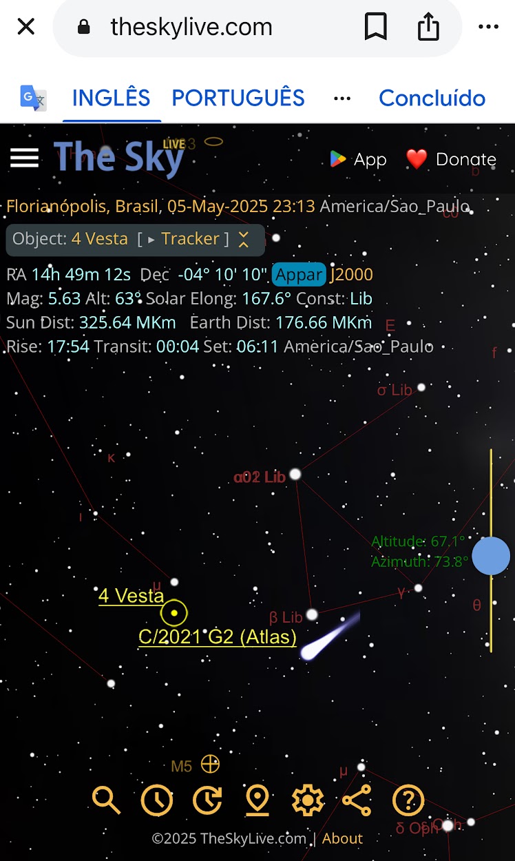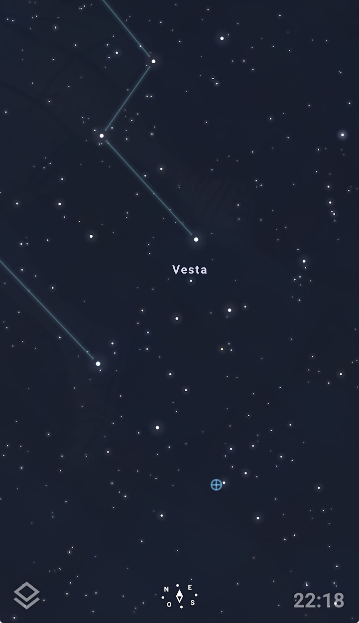 Dado este conjunto de circunstâncias, o GEA empreendeu sua primeira Campanha de Observação de um Asteroide. Sendo esta atividade inédita para o Grupo, o principal objetivo foi conquistar o aprendizado deste tipo de observação de fenômeno celeste do Sistema Solar. Independente dos sucessos de importantes observações anteriores, , tal qual o fabuloso Trânsito do Planeta Vênus em 08 de Junho de 2004, sabíamos que os desafios desta experiência seriam muito mais desafiadores. Ao nosso favor, contávamos especialmente com uma câmera de excelente imageamento do céu – Canon EOS RP com lente Grande angular D-Dreamer 15mm F2.0 – pertencente a Coordenadora de Astrofotografia do GEA, a muito entusiasta e habilidosa Márcia Philippe. Um iPhone 16 com exposição noturna também foi utilizado. O treinamento em dezenas de Cursos GEA de Leitura de Céu e Constelações permitiu fácil identificação do sítio da oposição de Vesta, que estava transitando entre as constelações de Balança e Virgem. Mapas Celestes mais confiáveis encontrados na IAU (International Astronomical Union) foram de grande utilidade.