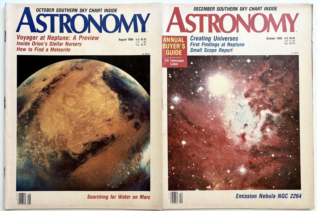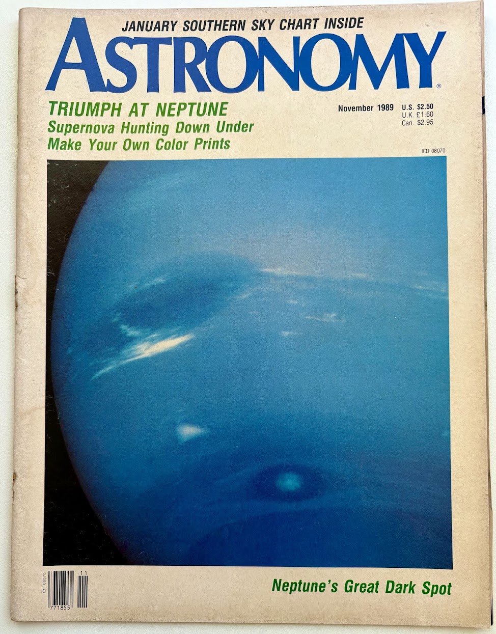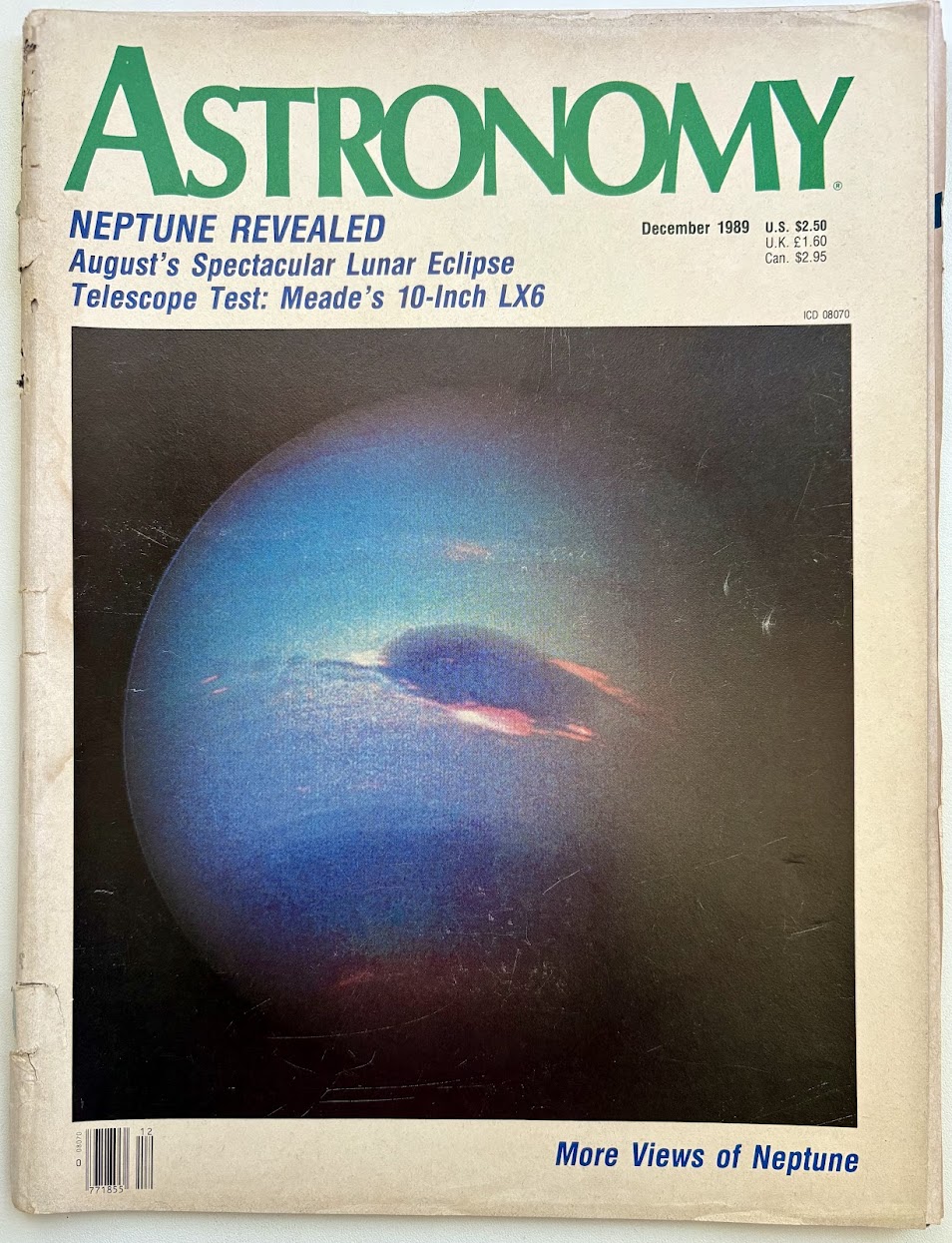 É necessário lembrar que estávamos no ano de 1989. A internet chegaria na década seguinte, o Windows em 1995. Então, sem e-mails, aplicativos e sites, nos restavam as publicações internacionais que felizmente, mesmo ao peso de dólares, chegavam com certa brevidade. Neste terreno, a maravilhosa Astronomy Magazine era o bálsamo cósmico que mitigava nossa busca por todas as atualizações da astronomia que evoluía dia a dia. Vejamos a sequência das publicações que adicionavam mais e mais curiosidade e emoções sobre Netuno: