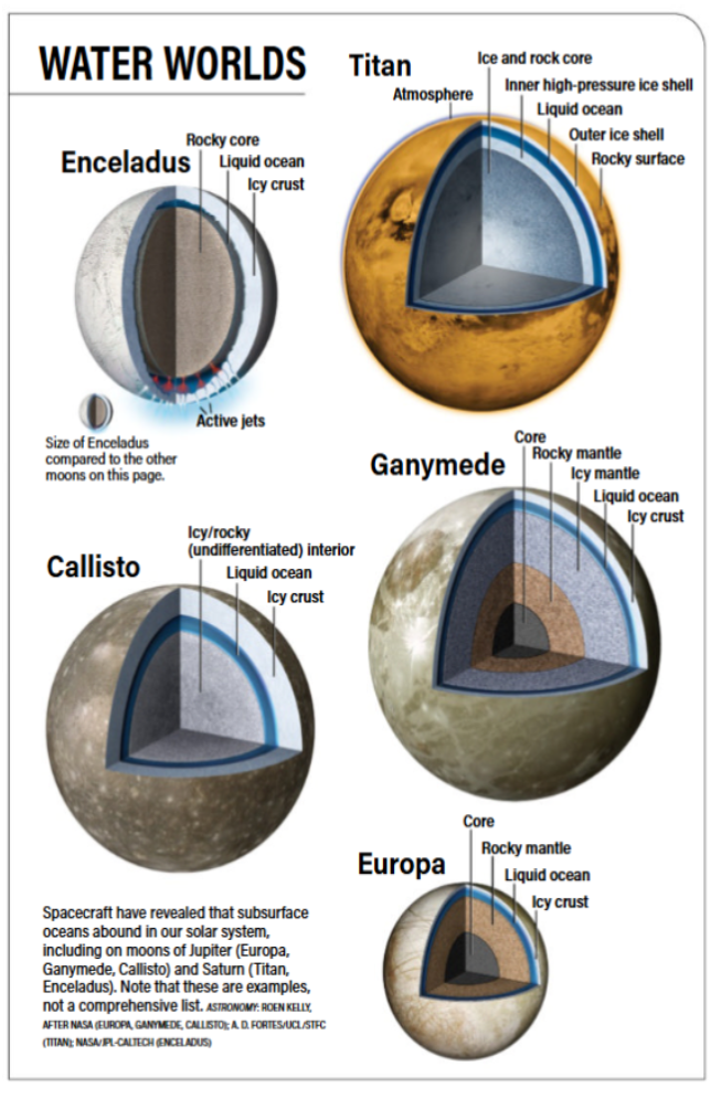 A partir do final da década de 1990, uma série de missões de naves espaciais revelou que o sistema solar, de fato, contém outros mundos oceânicos. Mas esses oceanos não são como os nossos porque ficam sob (em vez de em cima) da crosta de seu mundo.